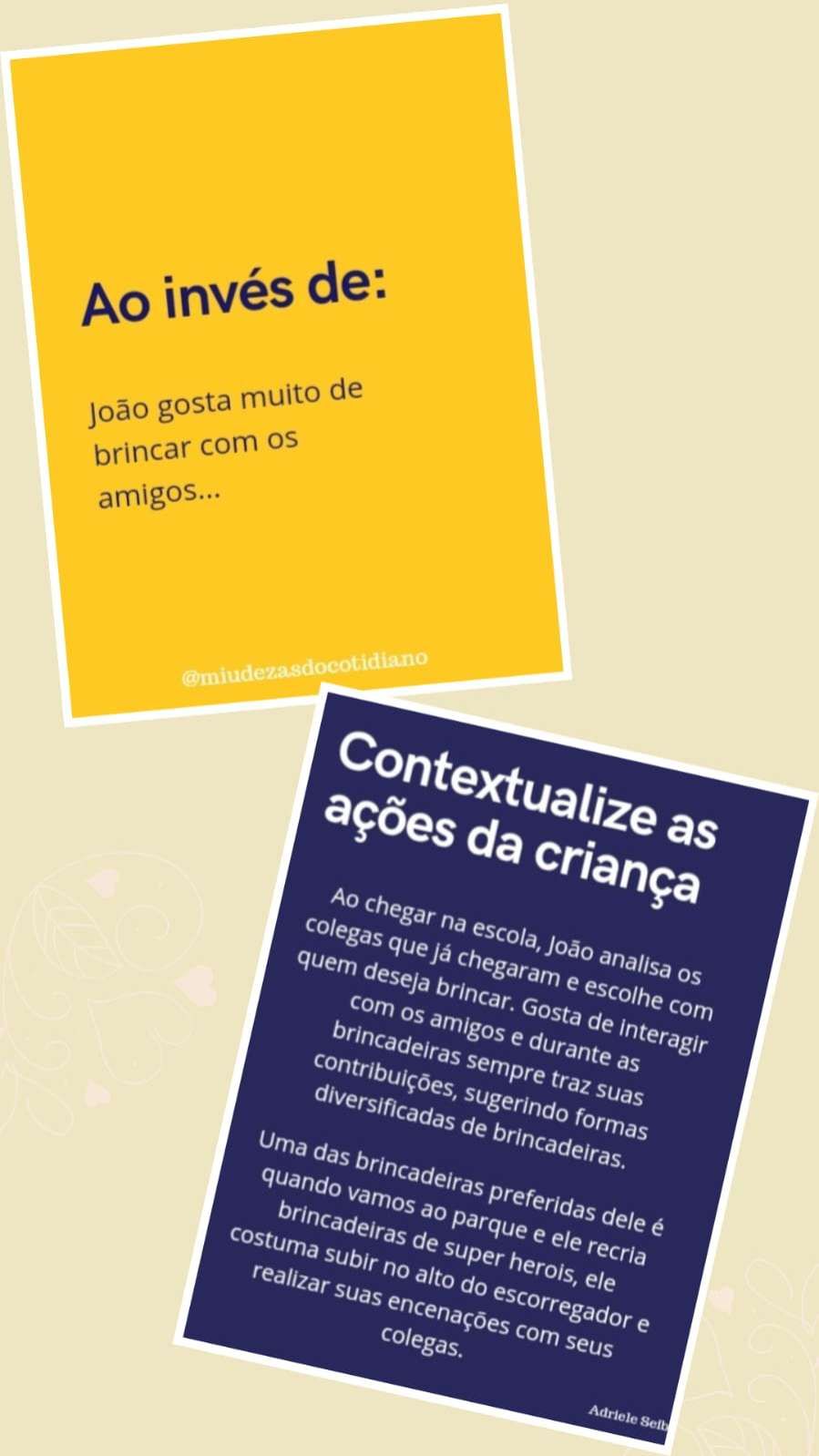Professora de Educação Infantil e apaixonada pela profissão, criadora da página @miudezasdocotidiano, ajudo outros professores a se inspirarem nas práticas pedagógicas que realizo no cotidiano com as crianças. Nesse processo de Ensino-Aprendizagem, ajudo o professor a compreender e realizar a Documentação Pedagógica, tornando visível o aprendizado dos nossos pequenos. Meu intuito é auxiliar o professor durante esse processo, fazendo com que suas práticas pedagógicas sejam pautadas pelo respeito, curiosidade e protagonismo infantil.